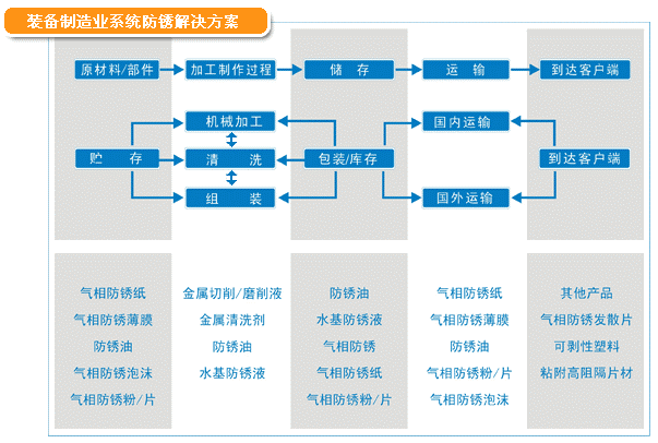 裝備制造業(yè)從原材料貯存,到加工制造、裝配、運(yùn)輸,每一個(gè)環(huán)節(jié)都會(huì)面臨銹蝕問題。該領(lǐng)域?qū)τ诜冷P產(chǎn)品具有需求范圍廣、個(gè)性化要求高、技術(shù)支持需求明顯等特點(diǎn)。我們按客戶材質(zhì)、工藝和儲(chǔ)運(yùn)要求,進(jìn)行系統(tǒng)的防銹防護(hù)解決方案。已成功完成小到微型電機(jī)、大至成套工程機(jī)械的防銹防護(hù)方案設(shè)計(jì)和多年驗(yàn)證工作。為我國(guó)裝備制造業(yè)發(fā)展保駕護(hù)航!