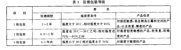 ①包裝的防潮等級應(yīng)根據(jù)產(chǎn)品的性質(zhì)、流通環(huán)境、儲運時間、包裝容器的一般性能等因素來確定防潮包裝等級分為1級包裝、2級包裝、3級包裝,詳見表1。